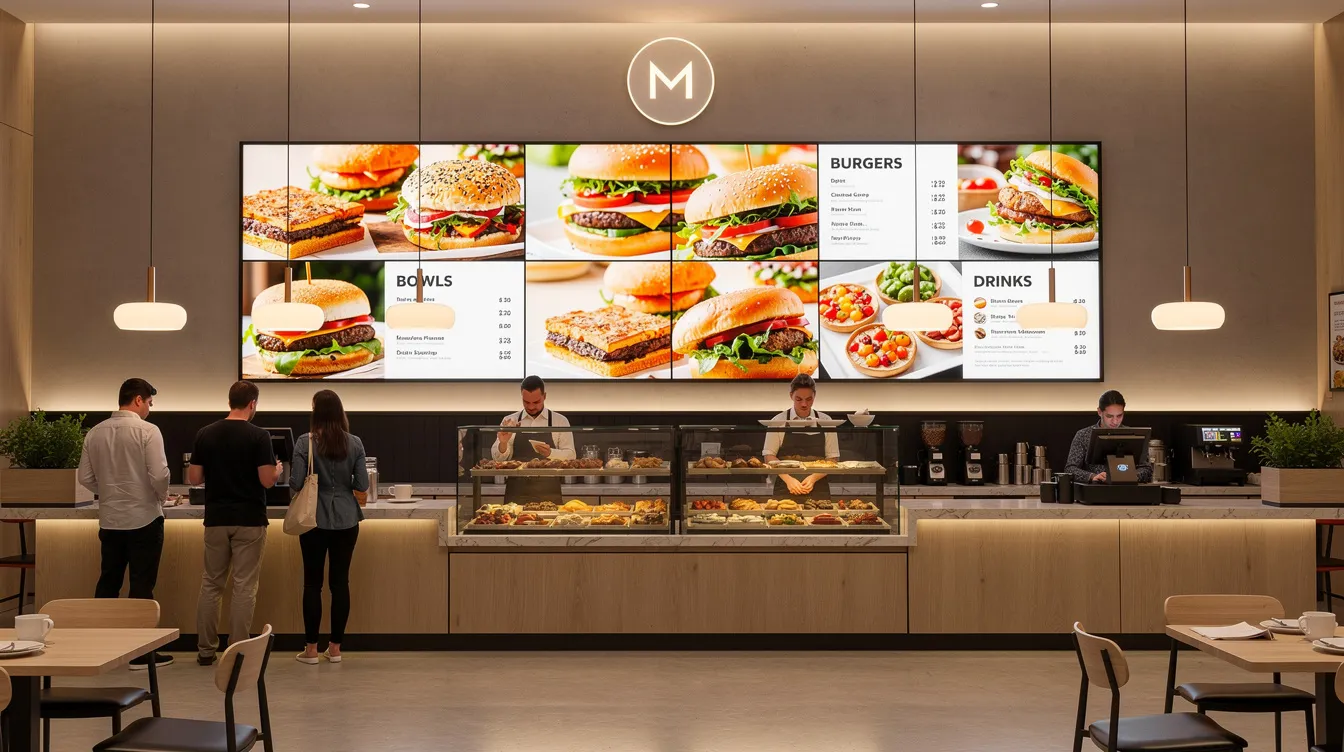 • Restaurants and cafés: Digital menu boards behind counters, drive-thru screens with time-based layouts (breakfast, lunch, dinner), and upsell panels encouraging higher-value orders